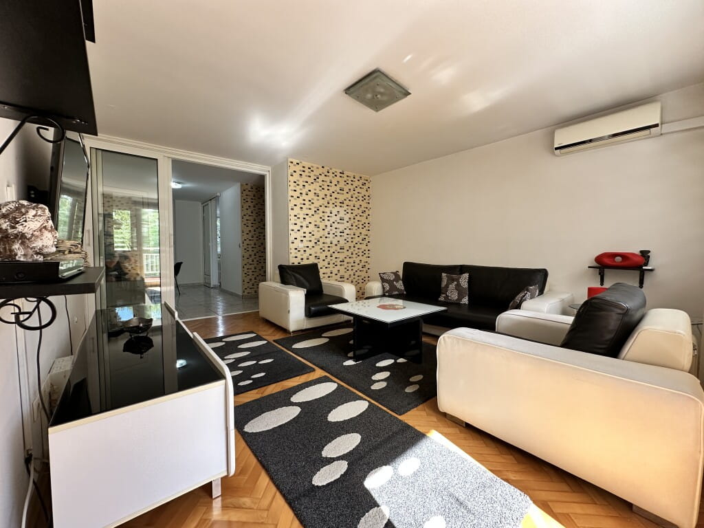 Trosoban stan veličine 77 m2, sastoji se od; hodnika, kuhinje, trpezarije, dnevnog boravka, dvije sobe, kupatila sa toaletom, odvojenog manjeg toaleta i dva balkona. Pod – parket, grijanje – gradsko centralno, klima, blind vrata. Kompletno namješten stan sa svim aparatima, bijelom tehnikom i ugradbenim plakarima.